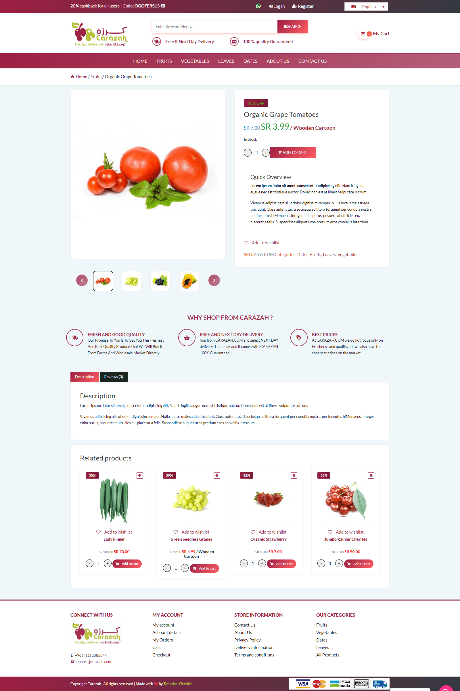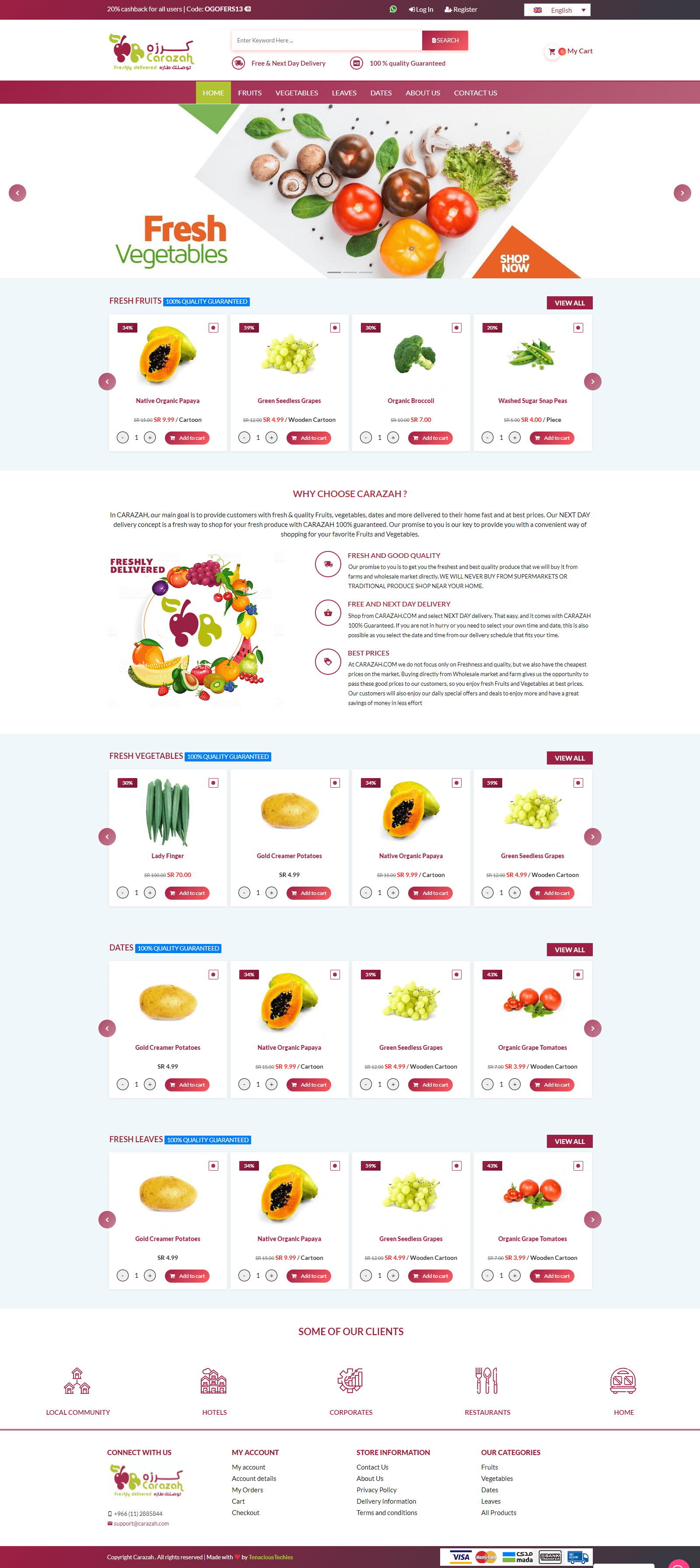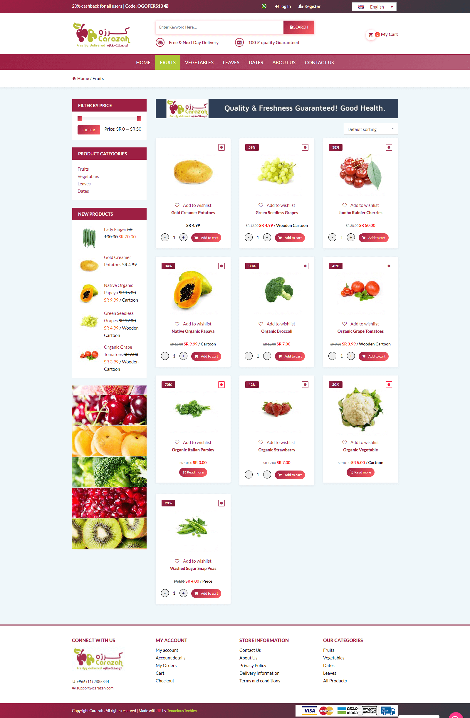 Carazah provides customers with fresh & quality Fruits, vegetables, dates and more delivered to their home fast and at best prices. Their NEXT DAY delivery concept is a fresh way to shop for fresh produce with CARAZAH 100% guaranteed. To upscale their Sales we developed one of the finest E-Commerce website for them with
